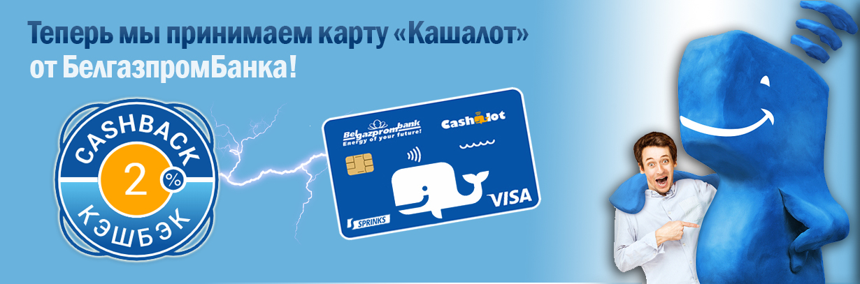 Рады вам сообщить, что теперь покупать товары у нас стало ещё выгоднее! Рассчитываясь в нашем магазине картой CashAlot от Белгазпромбанка вы получаете кэшбэк в размере 2% от стоимости покупки!